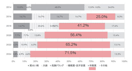 国立精神神経医療研究センターが実施した「全国の精神科医療施設における薬物関連精神疾患の実態調査(2024年)」によれば、精神科で治療を受けた10代患者において、市販薬を「主たる薬物」とする患者の割合は2024年には71.5%に及んでおり、2014年以降のその年次推移を図に示しますが急増しています。