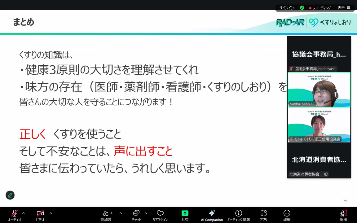 研修の最後には、学校でくすり教育を行っている養護教諭からのメッセージ動画を見ることで、学校現場でのくすり教育の実際について理解を深めてもらいました。