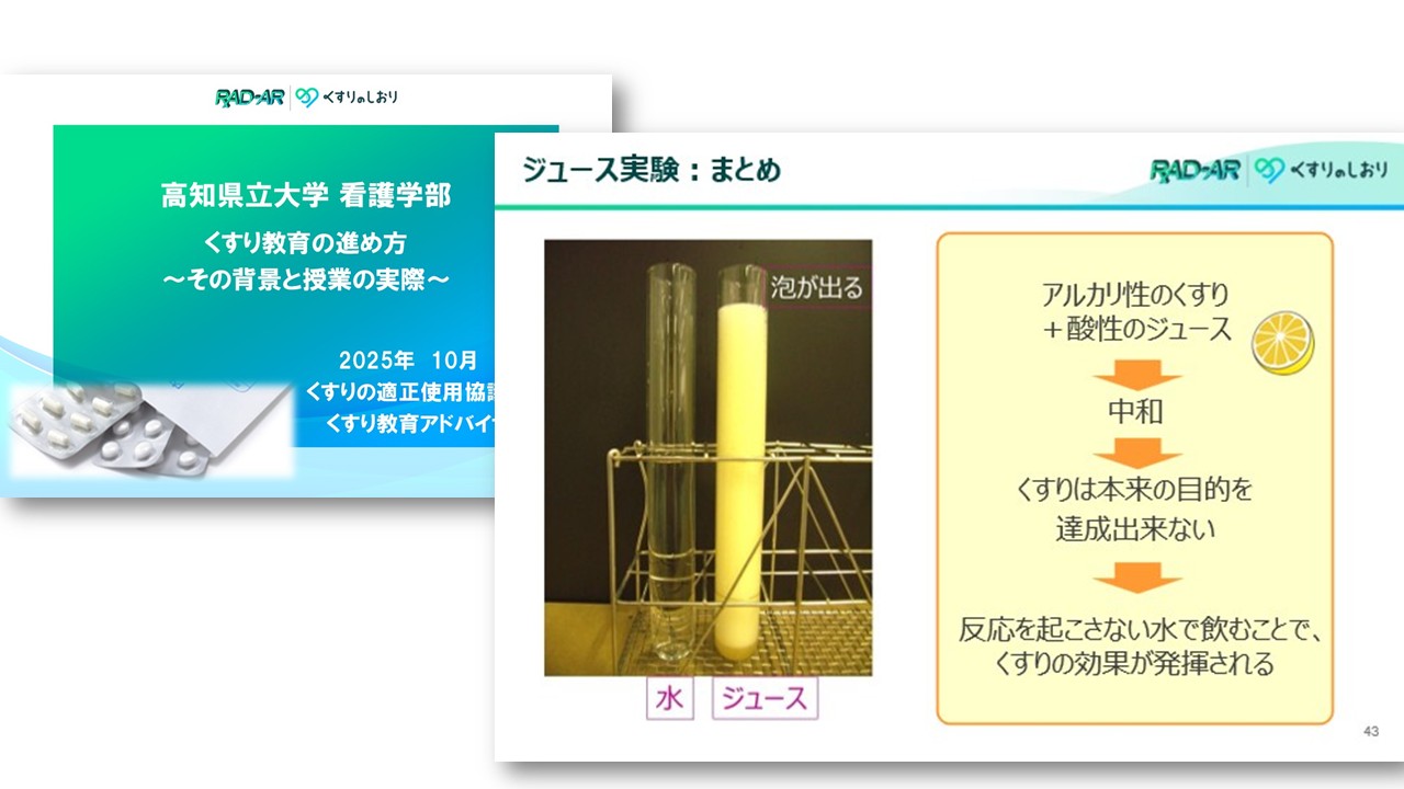 くすり教育・啓発委員会は、10月1日に養護教諭を目指している高知県立大学看護学部の4回生14名を対象に、くすり教育に関する研修をオンラインにて実施しました。