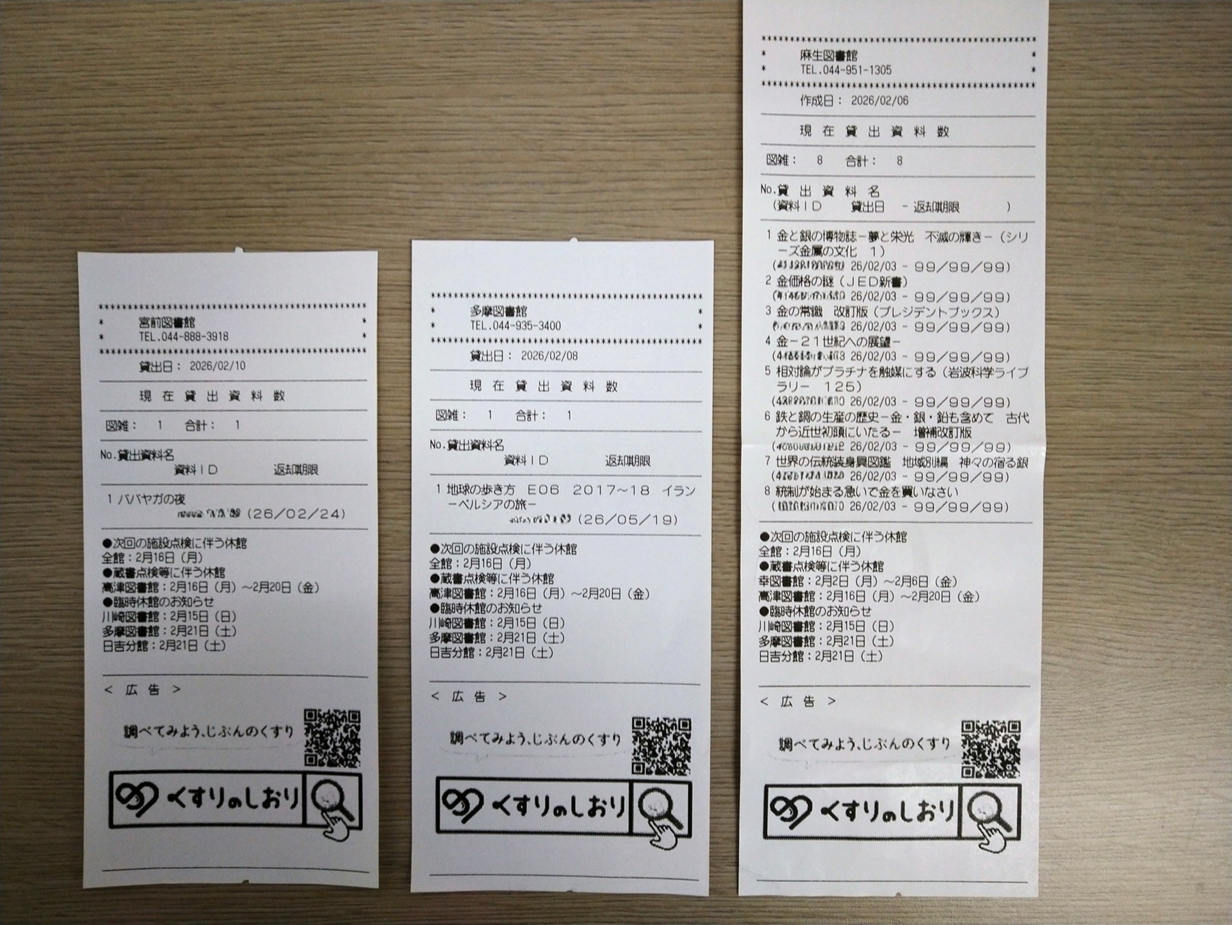 神奈川県の川崎市立図書館の3館で、貸出レシートにくすりのしおりを紹介する広告が掲載されています。